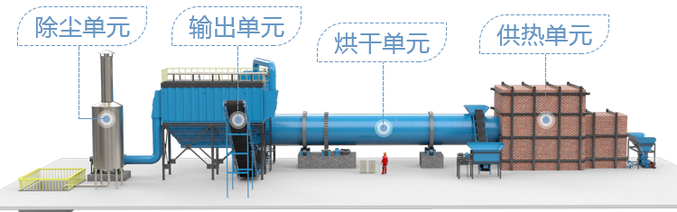 烘干系統(tǒng)主要由熱風(fēng)爐、上料輸送機、滾筒烘干機、出料輸送機、引風(fēng)機、旋風(fēng)除塵器、袋式除塵器(或者濕式除塵器)和操作控制系統(tǒng)構(gòu)成。設(shè)備采用順流干燥工藝,其工作原理如下:濕物料進(jìn)入干燥滾筒后分以下幾個工作區(qū):一是導(dǎo)料區(qū),瓷泥瓷泥進(jìn)入此區(qū)與高溫?zé)犸L(fēng)接觸迅速蒸發(fā)水分, 物料在大導(dǎo)角的導(dǎo)料板抄動下,被導(dǎo)入下一個工作區(qū);二是抄板區(qū),瓷泥瓷泥在此區(qū)被抄板抄起形成料幕狀態(tài),此時物料與熱風(fēng)充分接觸,瓷泥瓷泥中的水分迅速蒸發(fā)剝離成為水蒸氣,水蒸氣隨即被引風(fēng)機抽走,從而達(dá)到瓷泥瓷泥干燥的目的;瓷泥瓷泥在此區(qū)被干燥成水分小于5%(或者更低)以下的松散狀態(tài),經(jīng)過熱交換后物料達(dá)到所要求的水分狀態(tài),進(jìn)入最后的出料區(qū);三是出料區(qū),滾筒在此區(qū)不設(shè)抄板,物料在此區(qū)滾動滑行至排料口,完成整個烘干過程。